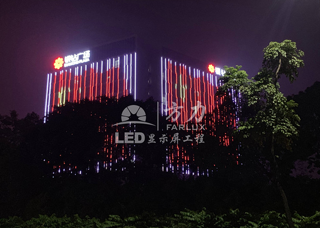 三、对于商业办公部分用静态的灯光 勾 勒 ,突出线条感及整体造型。两侧楼面采用简洁的投光灯配搭和 点缀, 体现出端庄和大气的感觉,
